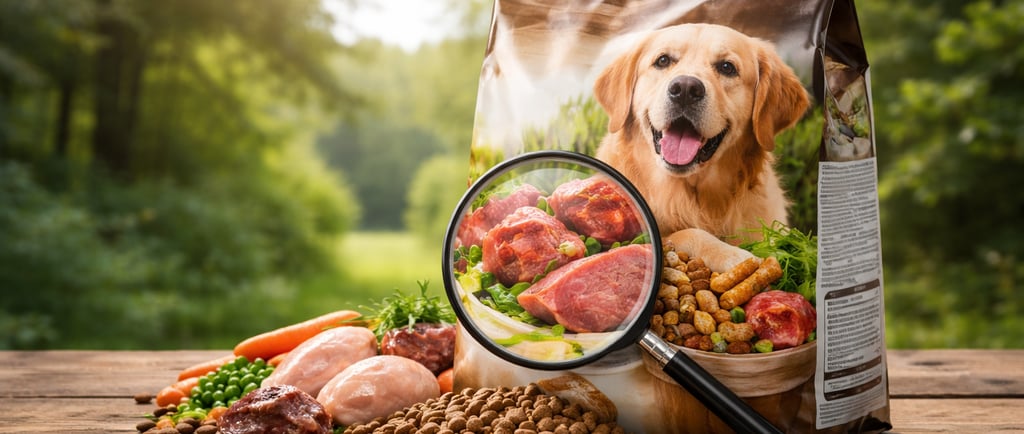 •Long-Keyword-Frage: "Wie erkenne ich hochwertiges Protein im Hundefutter?" An der offenen Deklaration und der spezifischen Benennung der Fleischquelle.