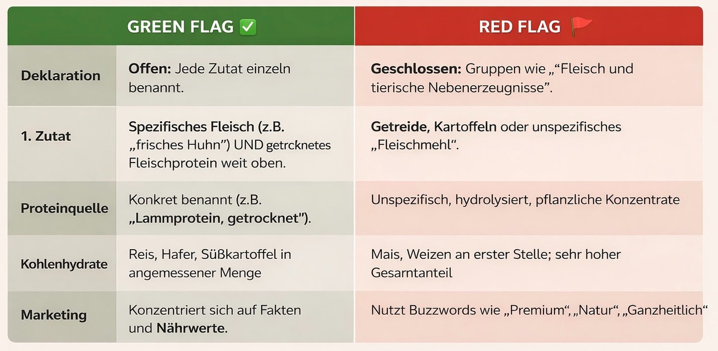 •Geschlossene Deklaration (RED FLAG 🚩): Hier werden Zutaten in Gruppen zusammengefasst. Beispiele: "Fleisch und tierische Nebenerzeugnisse", "Getreide", "Öle und Fette". Das ist legal, aber es erlaubt dem Hersteller, die Rezeptur ständig zu ändern, je nachdem, was gerade am billigsten auf dem Weltmarkt ist. Mal ist Huhn drin, mal Rind, mal Abfall. Du weißt es nie.